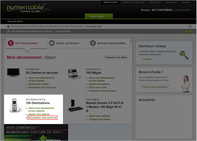 Dans l'onglet Mon Abonnement, allez sur la partie "Mon téléphone fixe" et cliquez sur “Paramétrer mes services”